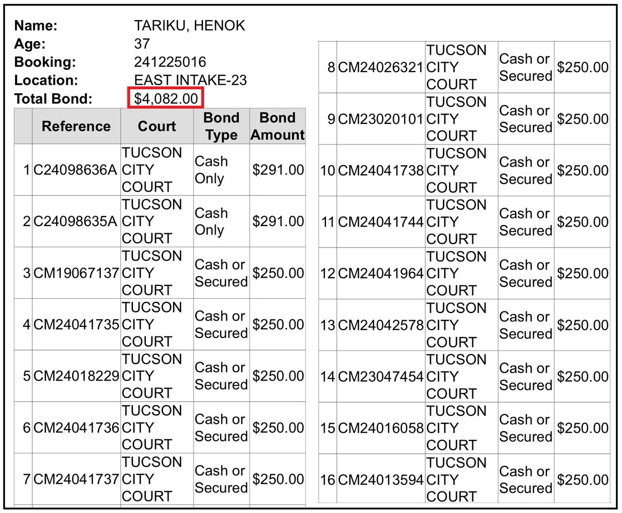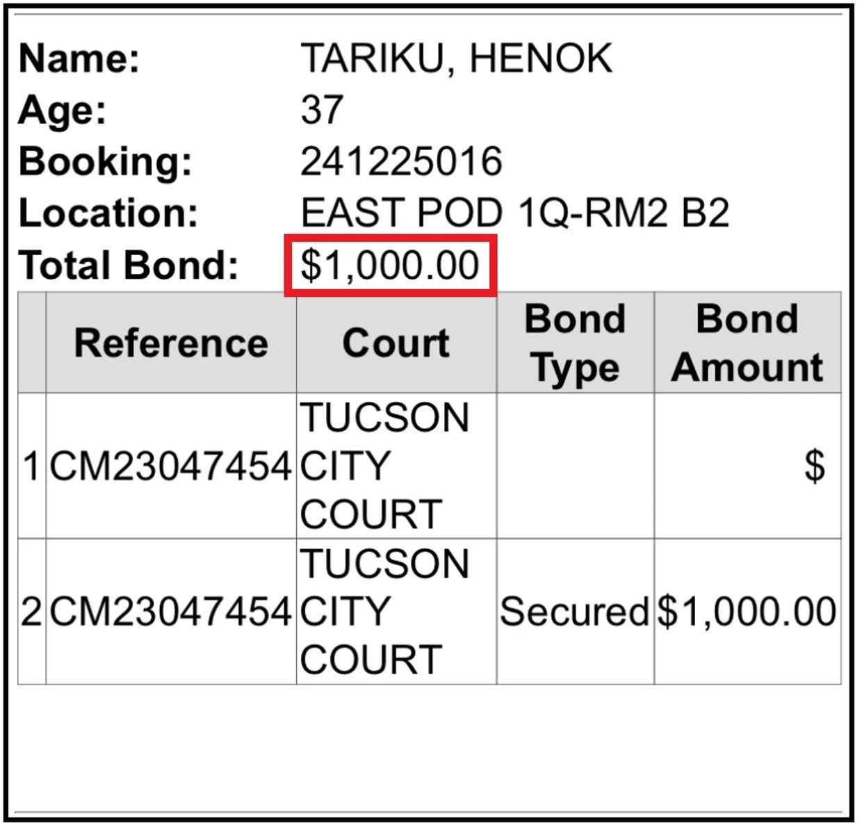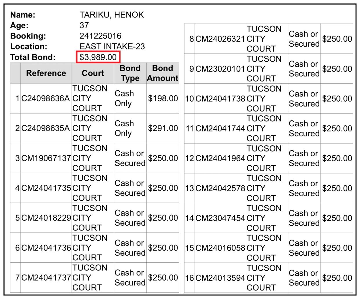 You can see that in just over 6 hours, Henok's bond amount went from $4082.00 to $3989.00. I'm not sure why. Maybe the arresting officer did a sloppy search and missed Henok's gift card from the Pima County Jail with $93.00 left on it. I just don't know.