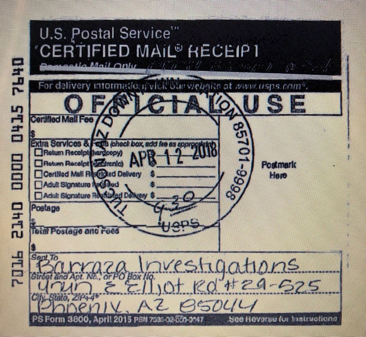 -Who is Barraza Investigations and how are they involved in this Tucson PD OPS investigation? Again, they are a Phoenix based “fully bi-lingual private investigative agency.” The certified mail receipt is dated April 12, 2018. Mr. Voss, or whatever Regina wants to call him, made his original request on April 20, 2018, 8 days after the correspondence with Barraza Investigations. So this was after the DUI arrest but before Mr. Voss’s original request and before Regina Romero made her announcement that she was running for mayor. We found the Barraza Investigations correspondence to be strange. There’s no explanation for this correspondence so we’ll just leave this as a question, why is this here?